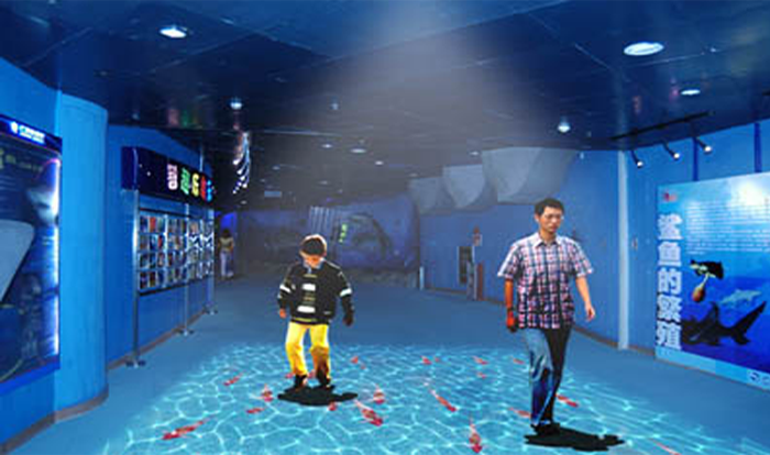 它可以是一片火红的枫叶,轻轻滑过就四处飘散;它可以是一个荷塘,漫步其上就荡起涟漪,鱼儿争宠;它可以是迷你的球场,让你体验一球成名……它是地面互动,一种将投影技术与互动识别结合的新型展示手段,将地面变为一块有趣的交互平台。