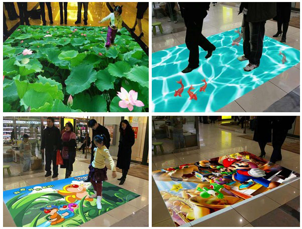 互动投影系统分为(地面互动投影、墙面互动投影、桌面互动投影、背投互动、互动橱窗、互动吧台、互动游戏) 互动投影系统是采用先进的计算机视觉技术和投影显示技术来营造一种奇幻动感的交互体验,系统可在你脚下产生各种特效影像。让你进入一种虚实融合、亦真亦幻的奇妙世界。该项目包括水波纹、翻转、碰撞、擦除、避让、跟随等表现形式(还可根据客户的要求开发各种特效)。观众通过身体动作来与地面的图像进行互动,地面投影系统能带给观众一种全新的互动体验。