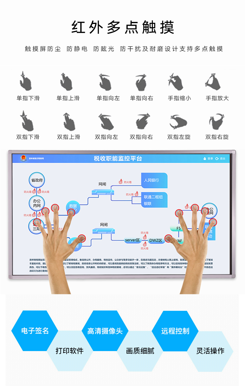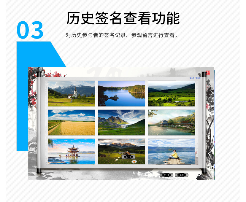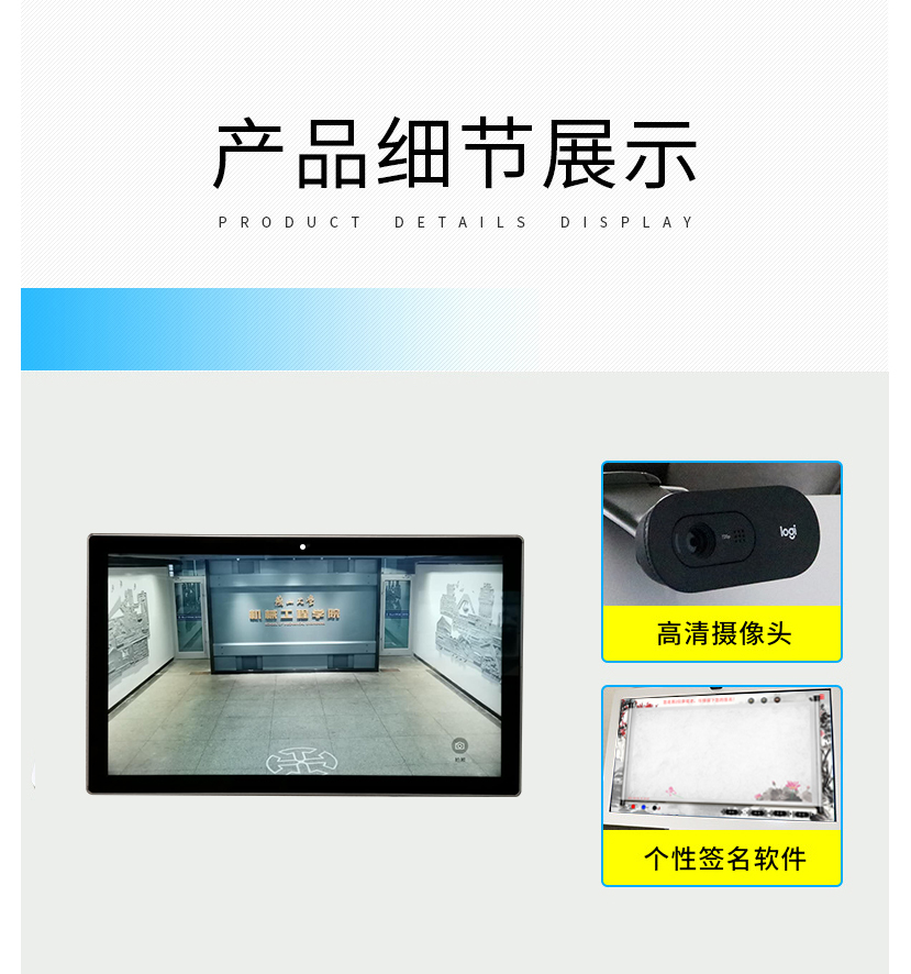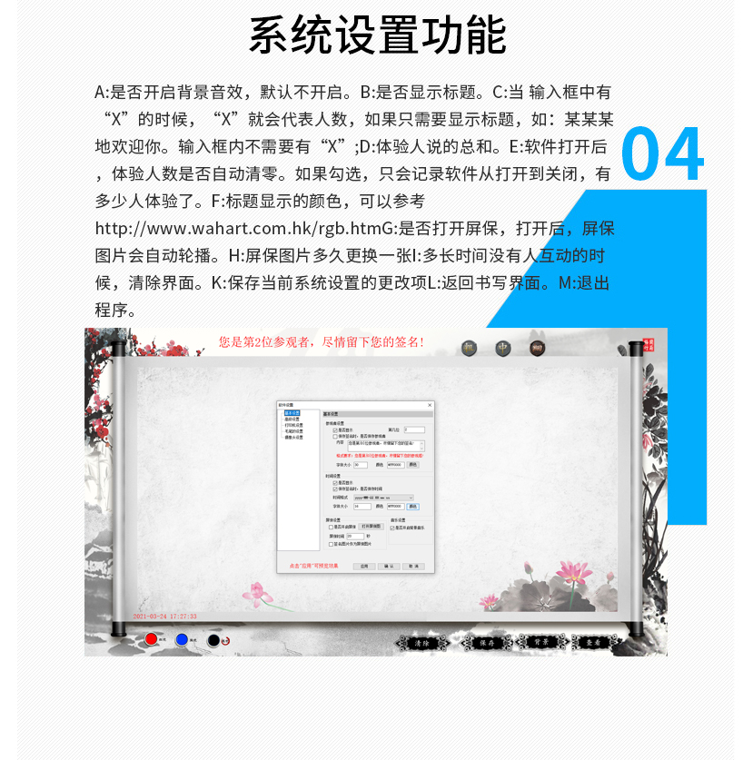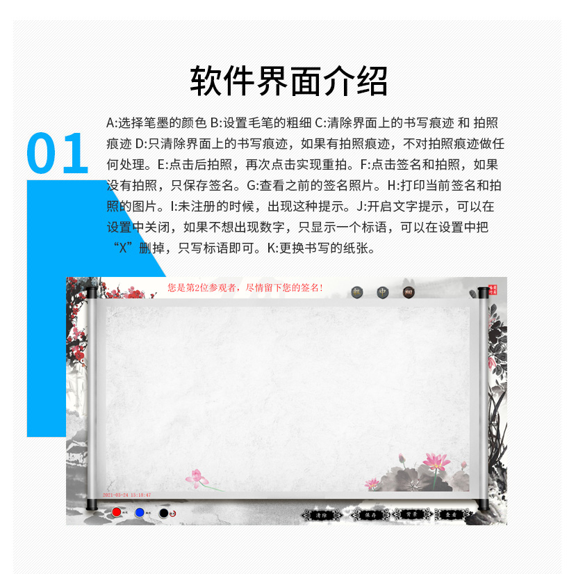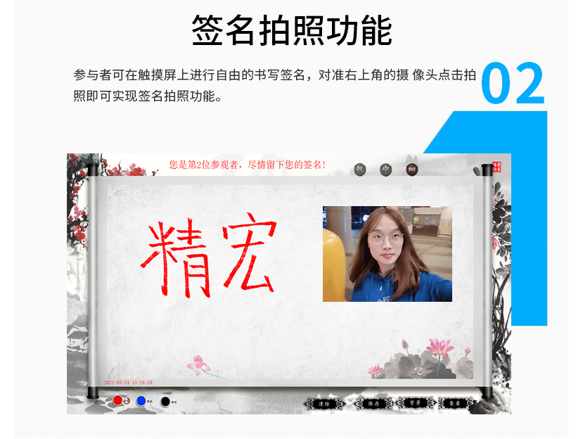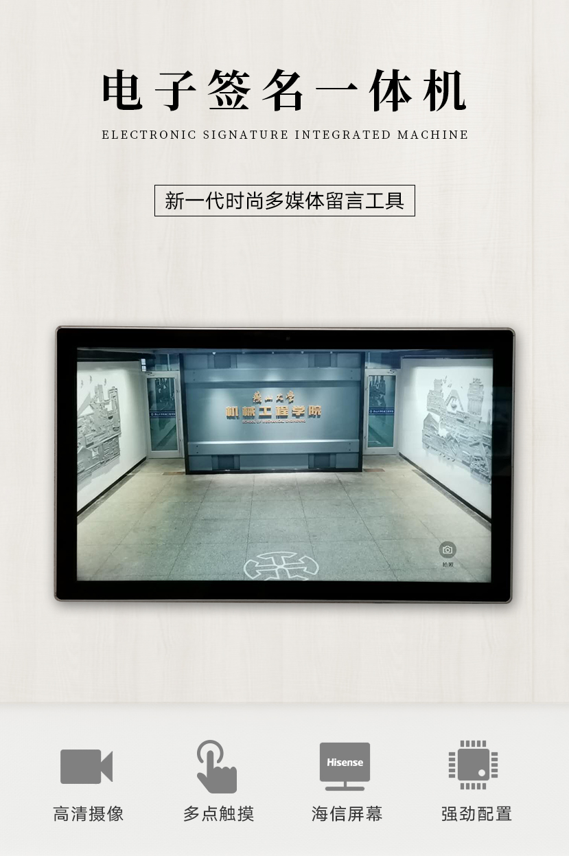 电子签名是新一代时尚多媒体留言工具,是一个集成了先进的手写数字技术,图像识别技术和多媒体软件技术于一体的高科技产品,参观者可以通过手写笔在液晶屏上进行自由的书写,发表参观感言、提写宝贵意见、留下珍贵纪念。软件背景可根据需求自行更换;签名笔刷大小、笔刷粗细均可调整,可供用户自行挑选;可连接客户提供各种型号usb摄像头,软件兼容性强;可根据需求调整摄像头坐标位置;可定义屏保,背景音乐;可清除,擦除;可进入后台删除图片,上传照片;可自定义屏保,字体大小,颜色,粗细,拍照倒计时,可扫码,打印