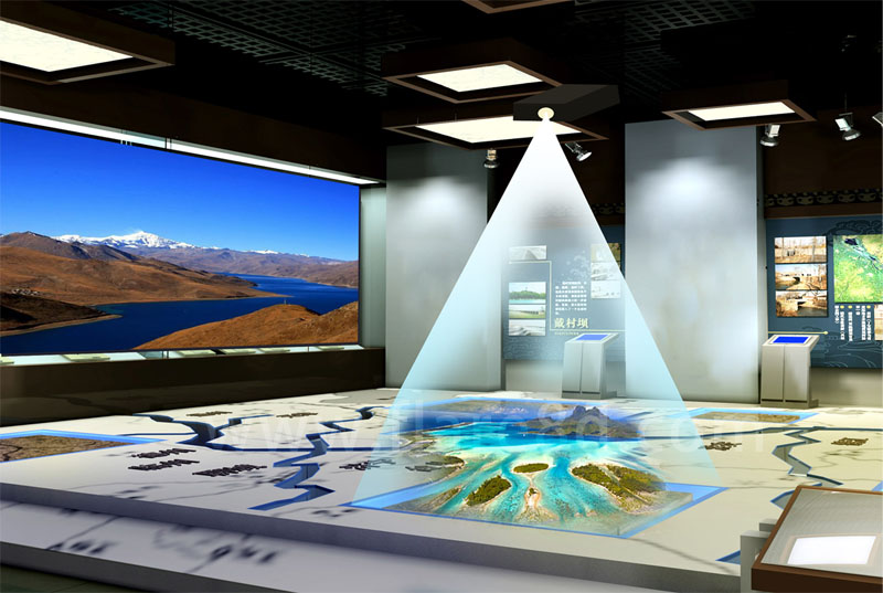 数字沙盘系统原理主要是运用多通道投影图像拼接、立体空间三维音效、智能化媒体设备控制等技术,在传统的物理沙盘模型的基础上,增加了多媒体展示与互动功能,能够充分的体现区位特点、配套设施、项目特色等信息。
