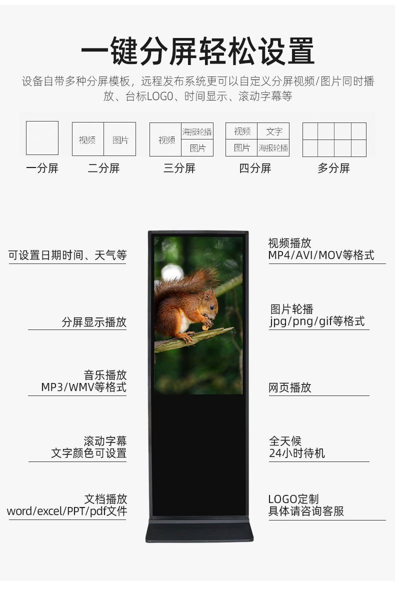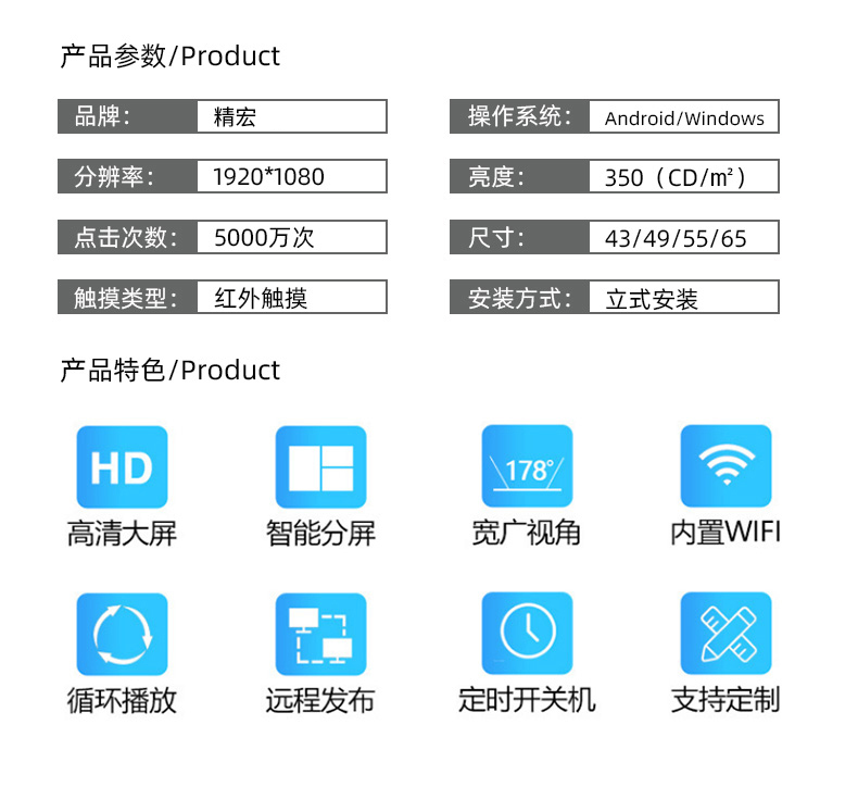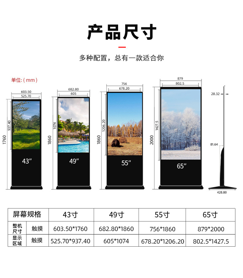 | 屏幕尺寸 | 13.3"/19"/21.5"/32"/43"/50"/55"/65"/75"/85" |